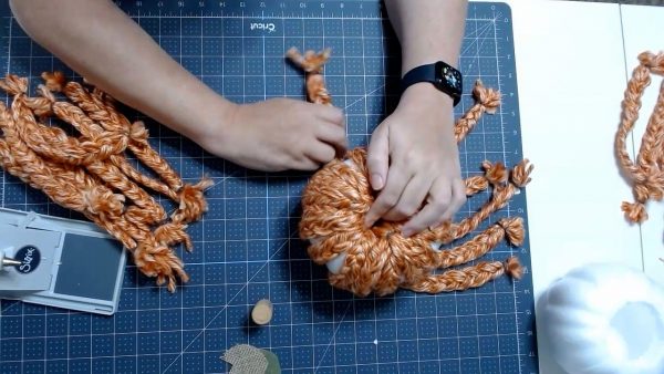 - Flip the pumpkin back over. This time you should be able to avoid the glue and just tuck the braids into the center of the hole. Go back and forth adding a few braids to the bottom and then tucking them in the top until you are satisfied with the look of your pumpkin.