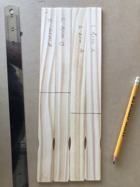 2. Cut the small paint stir sticks – 2 at 7-1/2” and 2 at 6” (arms)